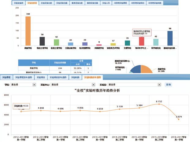 系统提供丰富的图表分析功能,能对各学院的实验室面积、房间数、设备台套数、实验人员、可容纳实验课程、可容纳实验时数、实验项目历年趋势、实验时数历年趋势等进行柱状图、饼图、曲线图的图表分析。